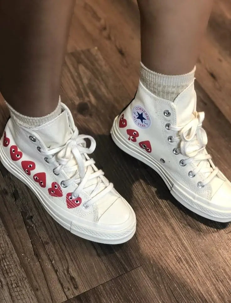 Descubre el icónico estilo de las Converse Chuck Taylor All Star 70 Hi Comme des Garcons PLAY Multi-Heart White. Estas zapatillas combinan la clásica silueta de Chuck Taylor con un diseño contemporáneo, adornadas con el distintivo logo de corazones de Comme des Garcons. Su color blanco puro las convierte en un modelo versátil, ideal para cualquier outfit. Confeccionadas con materiales de alta calidad, ofrecen comodidad y durabilidad. Perfectas para quienes buscan un toque de originalidad en su calzado, estas zapatillas son una declaración de estilo que captura la esencia de la moda urbana. Eleva tu look con estas impresionantes sneakers.